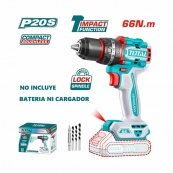 Taladro Total de 20V, con motor brushless y torque de 66 Nm, ideal para perforar concreto, madera y metal. Resistente, portátil y profesional, incluye mandril metálico de 13 mm, 2 velocidades y función de impacto para trabajos exigentes en obra e instalaciones.